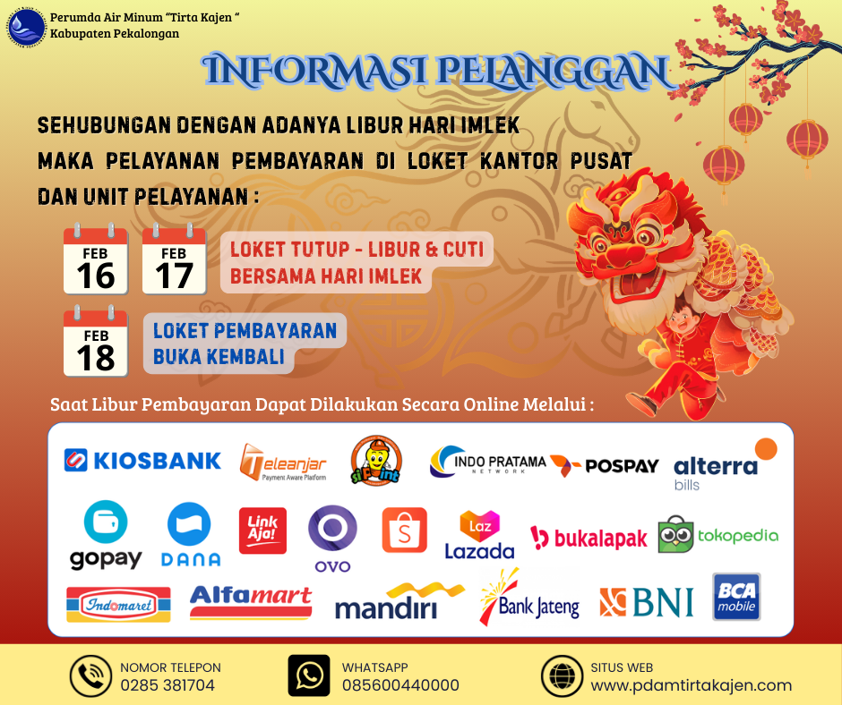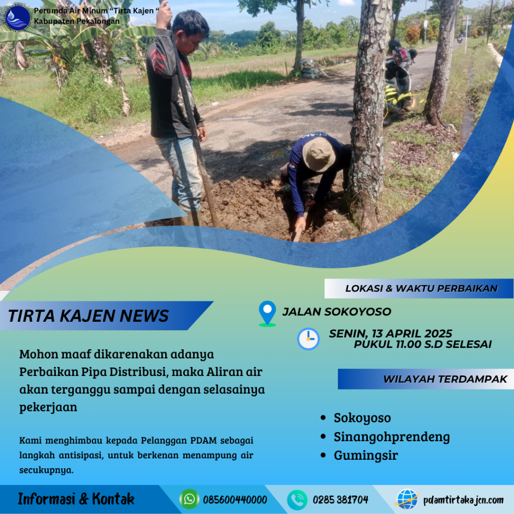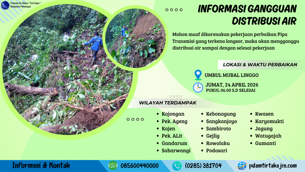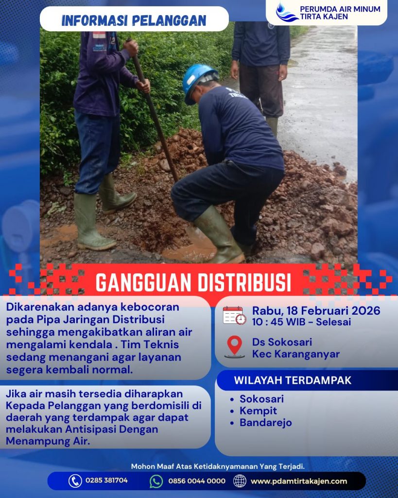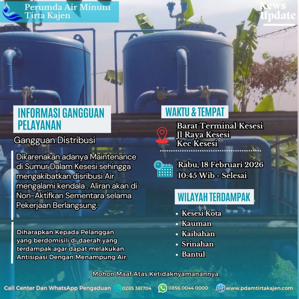 18Feb, 2026 Informasi gangguan distribusi air untuk wilayah kesesi dan karanganyar pada Rabu, 18 Februari 2026