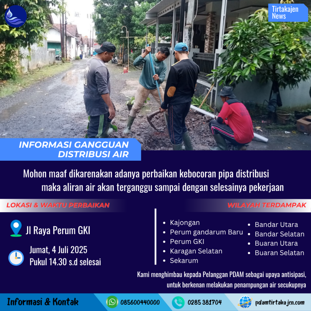 Informasi Perbaikan Pipa Distribusi 4 Juli 2025 di Perum GKI