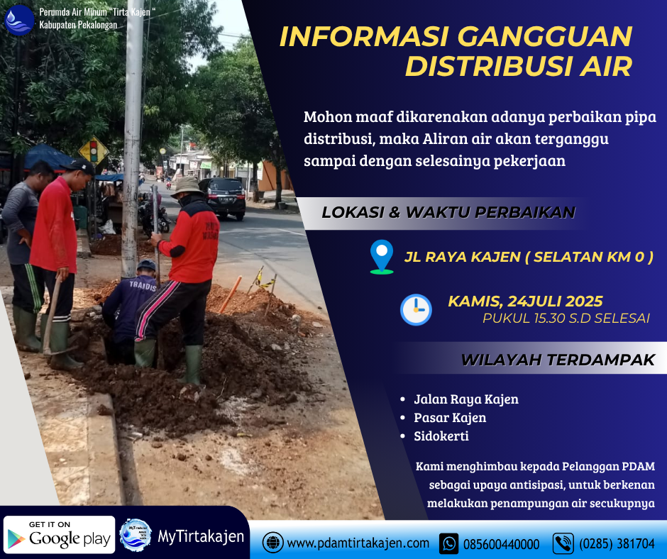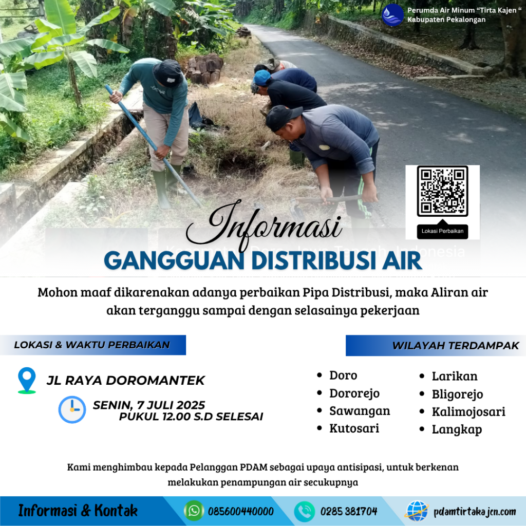 Informasi Perbaikan Pipa Distribusi di Jalan Raya Kajen pada Kamis, 24 Juli 2025