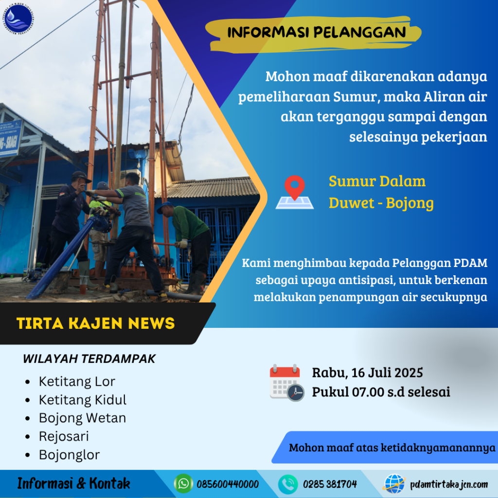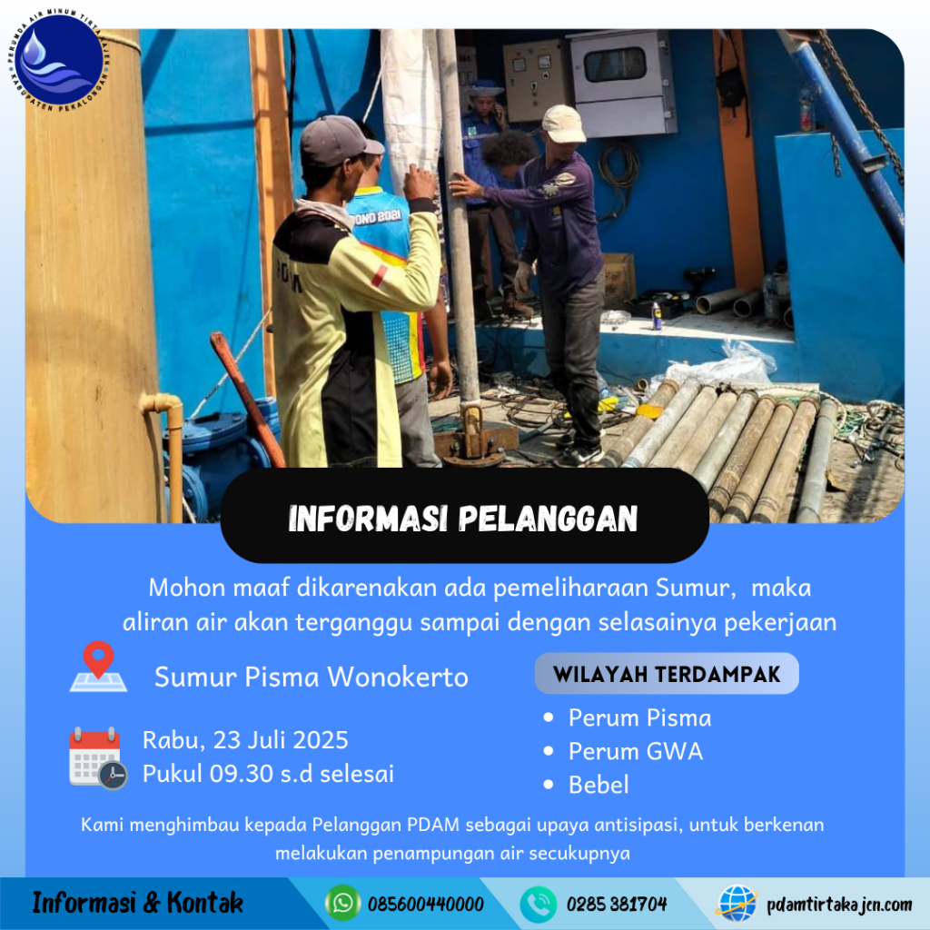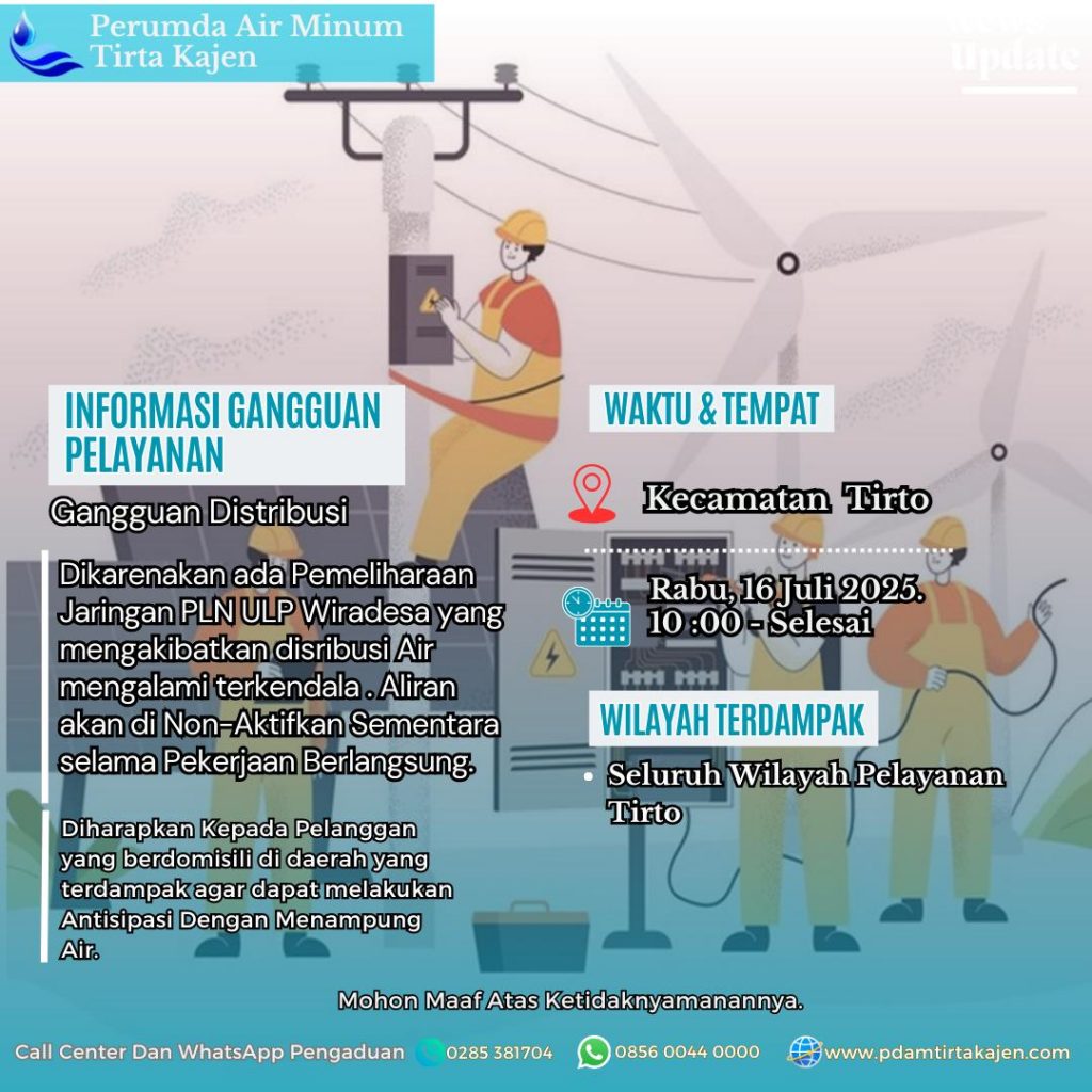 Informasi gangguan distribusi air pada Rabu 16 Juli 2025 di Wilayah Tirto dan Bojong