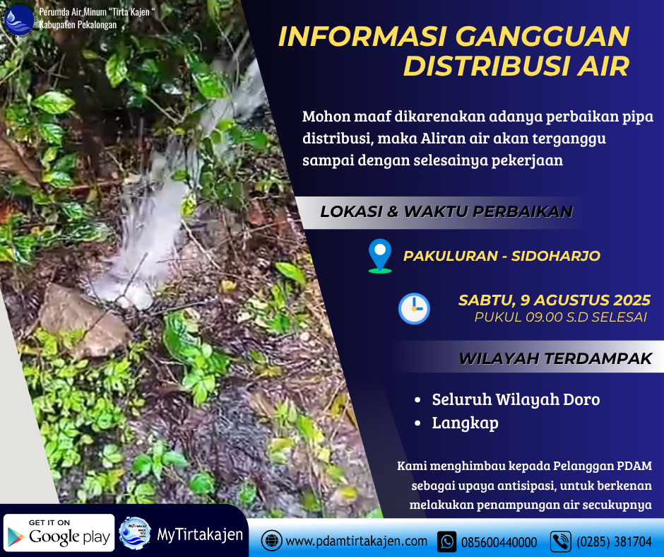 Informasi gangguan distribusi air di wilayah doro pada Sabtu, 9 Agustus 2025